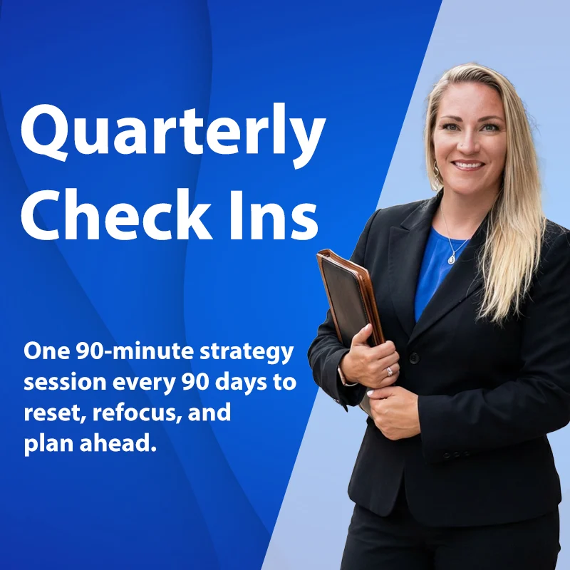 Quarterly Check Ins – $275/Quarter One 90-min strategy session every 90 days to reset, refocus, and plan ahead. Perfect for business owners who want clarity and direction without monthly check-ins.